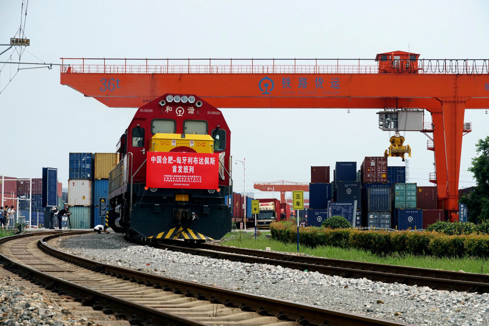 2022年7月29日,合肥至匈牙利布達(dá)佩斯的中歐班列從合肥北站物流基地駛出,標(biāo)志著合肥中歐班列通往匈牙利布達(dá)佩斯的線路正式開(kāi)通。新華社發(fā)(席靜玉攝)