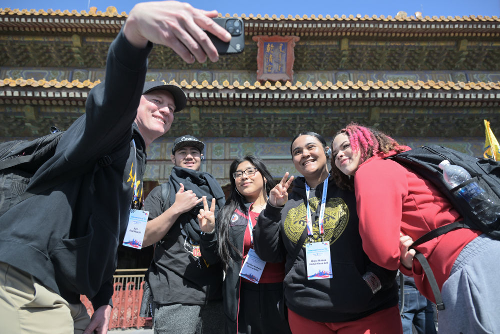 2024年3月19日,美國華盛頓州中學(xué)生代表團的成員在故宮乾清宮前合影留念?! ⌒氯A社記者 李鑫 攝