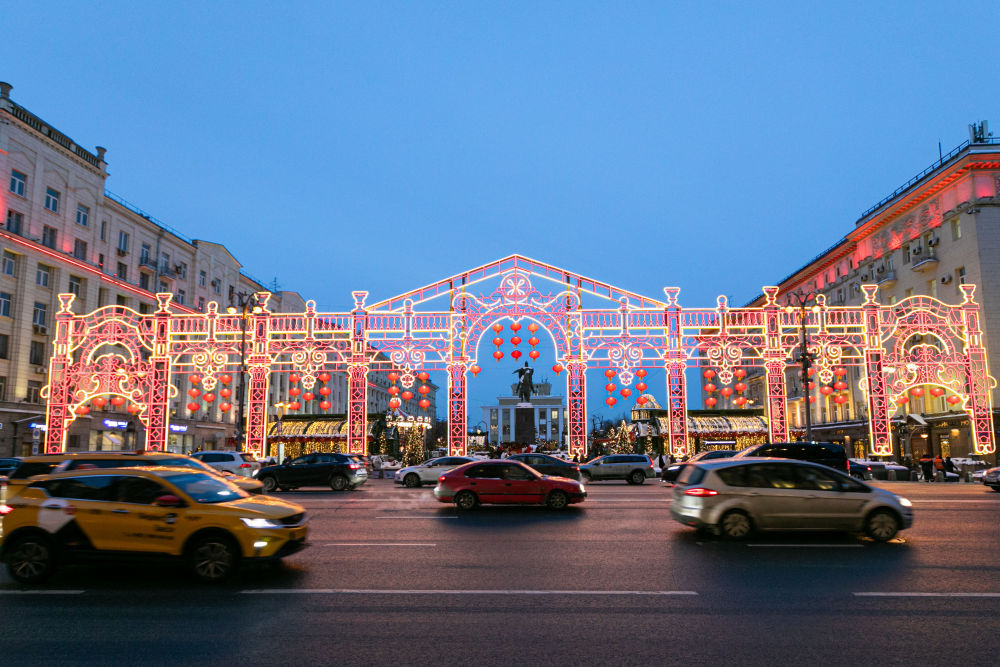 2024年2月9日,在俄羅斯首都莫斯科,車輛在中國新年主題裝飾前駛過。當(dāng)日,“莫斯科的中國新年”文化活動在俄羅斯首都莫斯科市中心啟動?! ⌒氯A社記者 白雪騏 攝