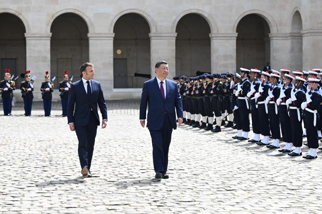 當(dāng)天下午,習(xí)近平在巴黎出席馬克龍舉行的隆重盛大歡迎儀式。兩國元首檢閱法蘭西共和國衛(wèi)隊和陸海空三軍儀仗隊,并觀看分列式。