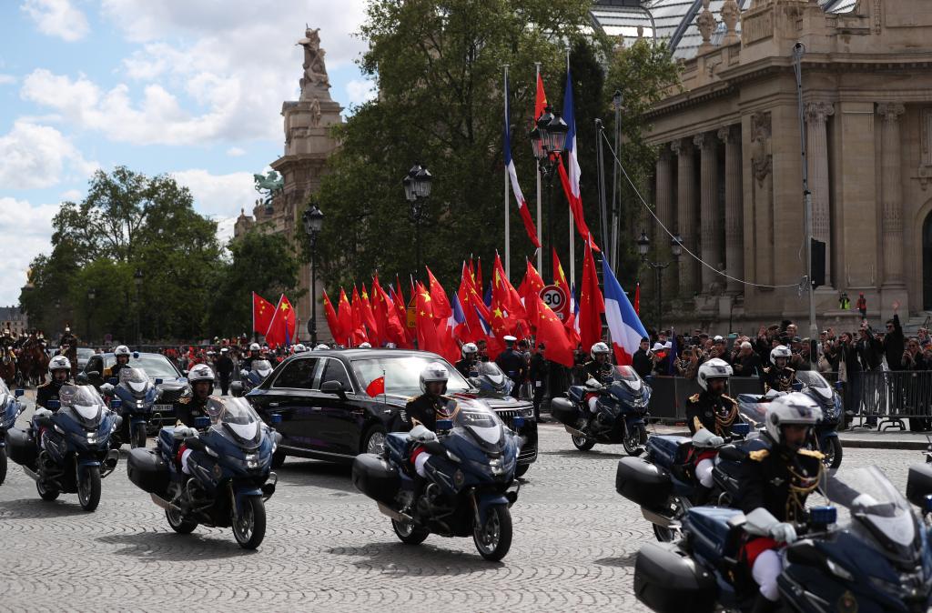 歡迎儀式后,習(xí)近平和夫人彭麗媛在共和國衛(wèi)隊148名騎兵組成的禮兵馬隊和摩托車隊護衛(wèi)下,乘車前往愛麗舍宮。