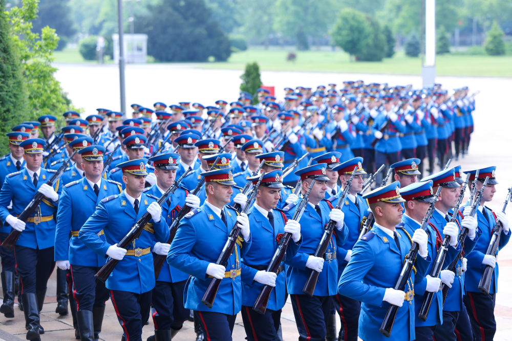 塞爾維亞大廈前,中塞兩國國旗迎風(fēng)飄揚,儀仗隊威武雄壯。