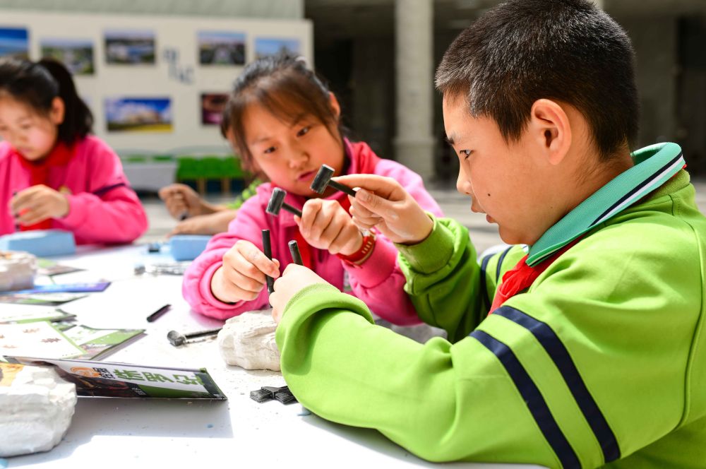 2024年4月22日,內(nèi)蒙古自治區(qū)鄂爾多斯市康巴什區(qū)實(shí)驗(yàn)小學(xué)在康巴什自然博物館開(kāi)展“探索自然奧秘 保護(hù)地球家園”主題研學(xué)活動(dòng),這是學(xué)生在研學(xué)課程中體驗(yàn)尋找動(dòng)物化石。