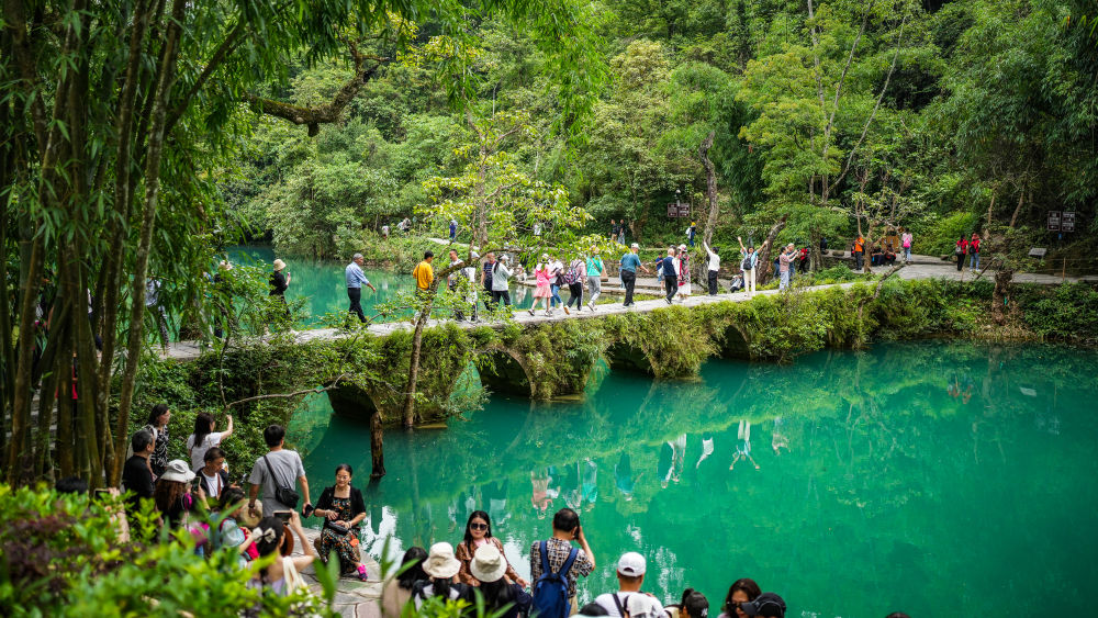 初夏時節(jié),貴州省黔南布依族苗族自治州荔波縣小七孔景區(qū)綠意盎然、風(fēng)光秀美,吸引眾多游客前來觀光游玩。新華社記者 陶亮 攝