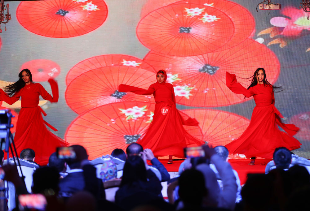 5月12日,參賽選手在埃及開(kāi)羅舉辦的第23屆“漢語(yǔ)橋”世界大學(xué)生中文比賽埃及大區(qū)賽上表演才藝。