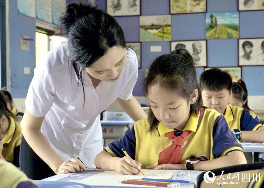 5月31日,南充市嘉陵區(qū)之江小學(xué),學(xué)生在老師指導(dǎo)下學(xué)習(xí)繪畫。人民網(wǎng) 趙祖樂攝
