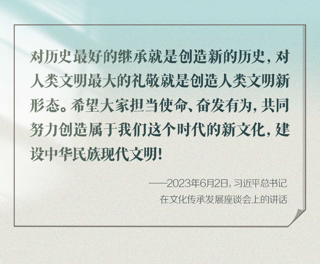 2023年6月2日,習近平總書記在文化傳承發(fā)展座談會上強調(diào):“在新的起點上繼續(xù)推動文化繁榮、建設文化強國、建設中華民族現(xiàn)代文明,是我們在新時代新的文化使命?!?/p>