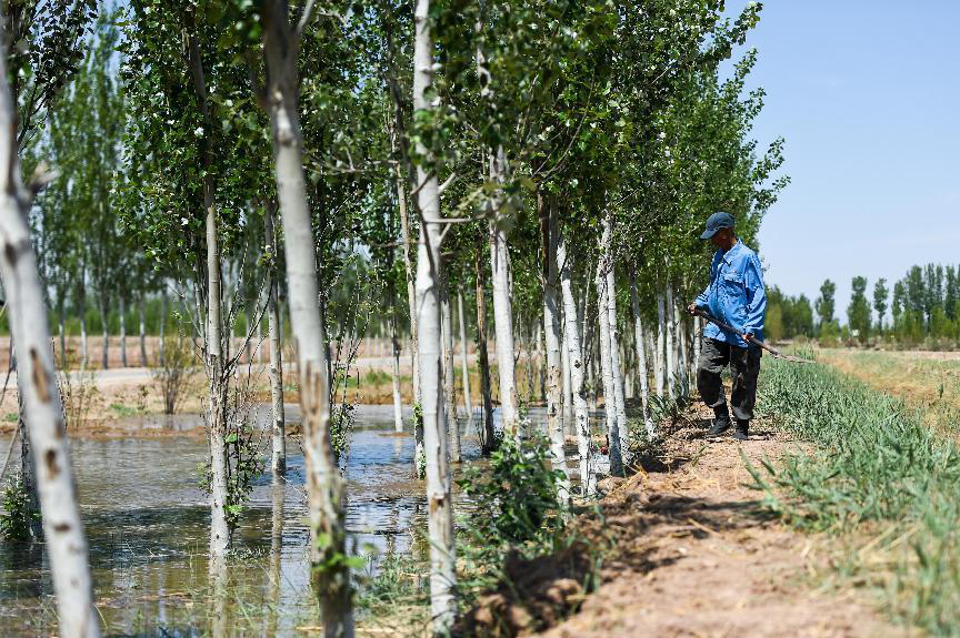 工人在內(nèi)蒙古巴彥淖爾臨河區(qū)國(guó)營(yíng)新華林場(chǎng)管護(hù)樹木(2024年5月26日攝)。數(shù)十年來,林場(chǎng)結(jié)合“三北”防護(hù)林、京津風(fēng)沙源治理、低質(zhì)低效林改造等生態(tài)工程,持續(xù)提高森林覆蓋率。