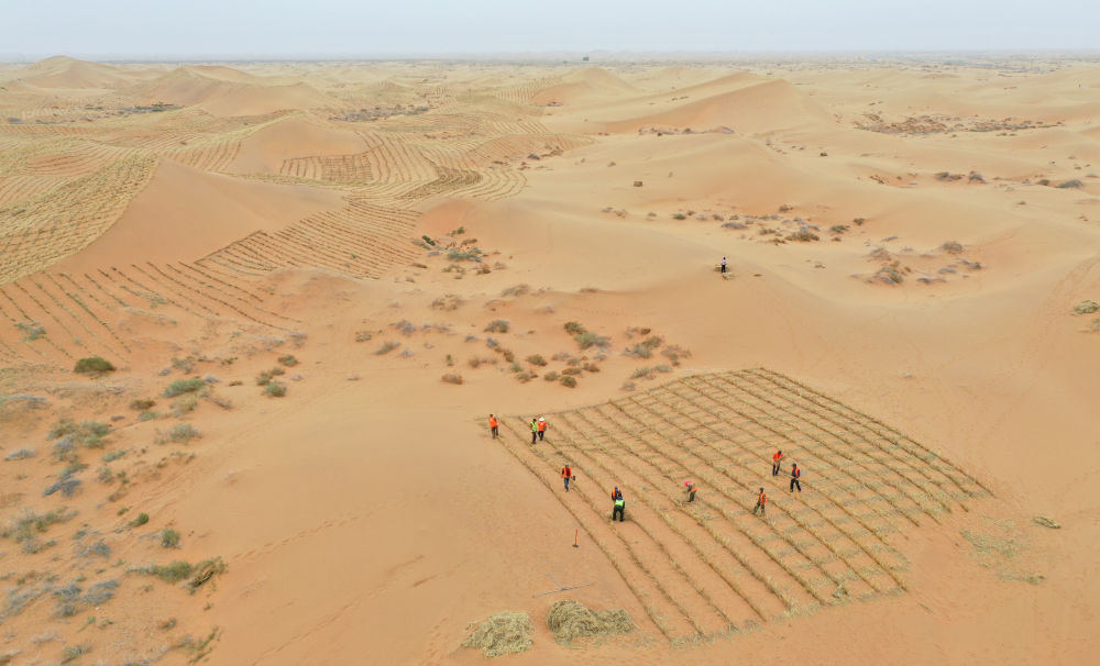 2024年4月27日,治沙工人在內(nèi)蒙古阿拉善左旗騰格里沙漠S315沿線固沙工程現(xiàn)場(chǎng)用稻草扎草方格(無人機(jī)照片)。