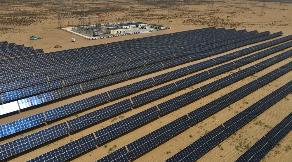 2024年5月16日在內(nèi)蒙古巴彥淖爾市磴口縣拍攝的烏蘭布和沙漠光伏基地(無人機(jī)照片)。烏蘭布和沙漠建設(shè)生態(tài)光伏基地,采取板上發(fā)電、板下種植的辦法,努力把沙海變?yōu)椤熬G?!薄?/p>