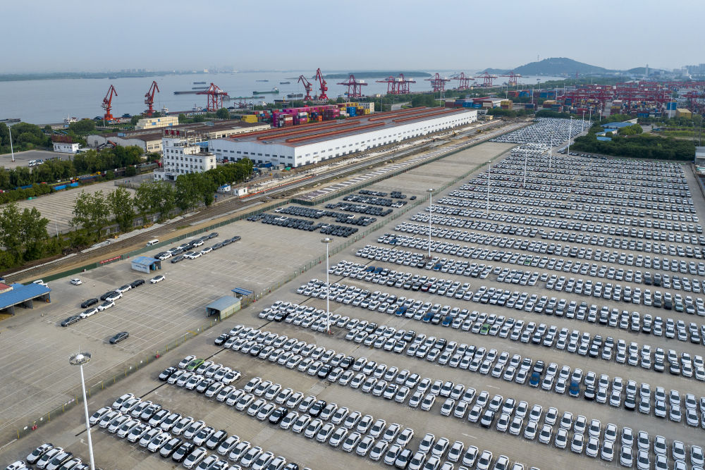2024年5月26日,在安徽蕪湖港朱家橋港區(qū)國際集裝箱碼頭,整齊排列的汽車等待出口(無人機照片)。作為安徽省首個國家一類開放口岸,蕪湖港現已發(fā)展成為長三角城市群綜合交通運輸體系的重要樞紐。