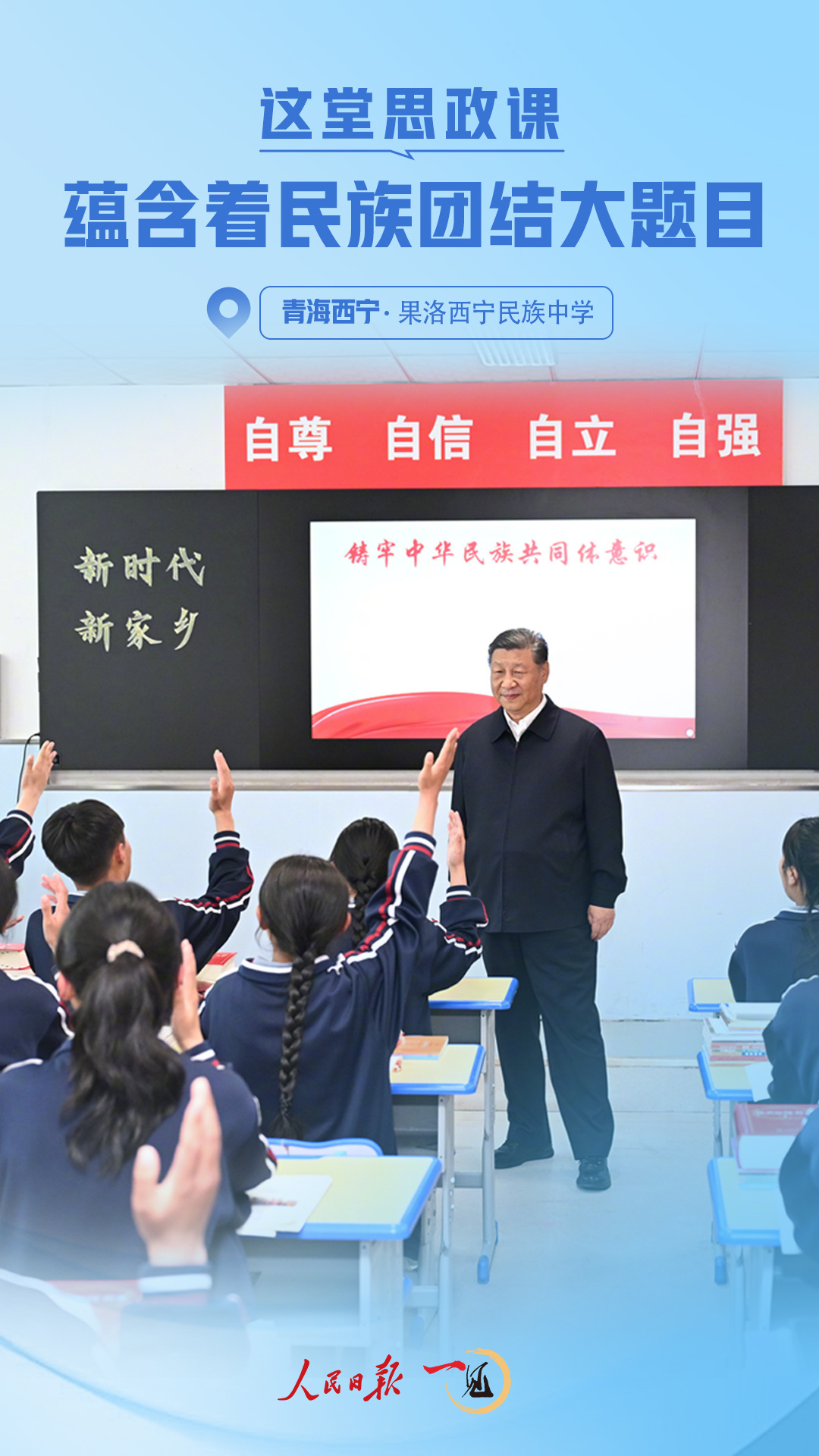 西寧城北,元朔山麓,藍天白云掩映下的果洛西寧民族中學(xué)綠意蔥蘢。6月18日,正在青海省西寧市考察的習(xí)近平總書記來到這里并觀摩了一堂思政課??倳泴λ颊n歷來很重視——這是落實立德樹人根本任務(wù)的關(guān)鍵課程,是培養(yǎng)社會主義建設(shè)者和接班人的重要保障。