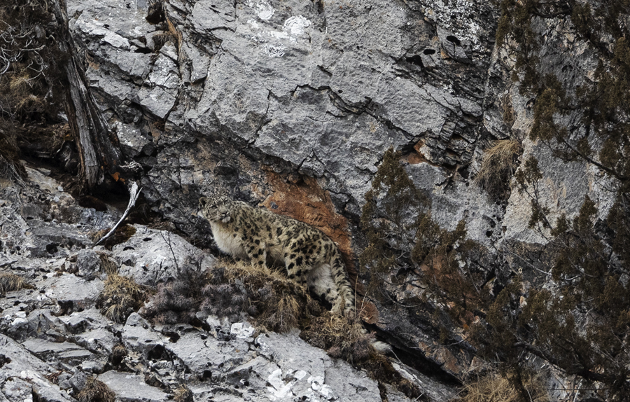2023年2月21日,在青海省玉樹藏族自治州雜多縣昂賽鄉(xiāng)境內(nèi)的昂賽大峽谷內(nèi),一只雪豹準(zhǔn)備向上攀爬。新華社記者 費茂華 攝