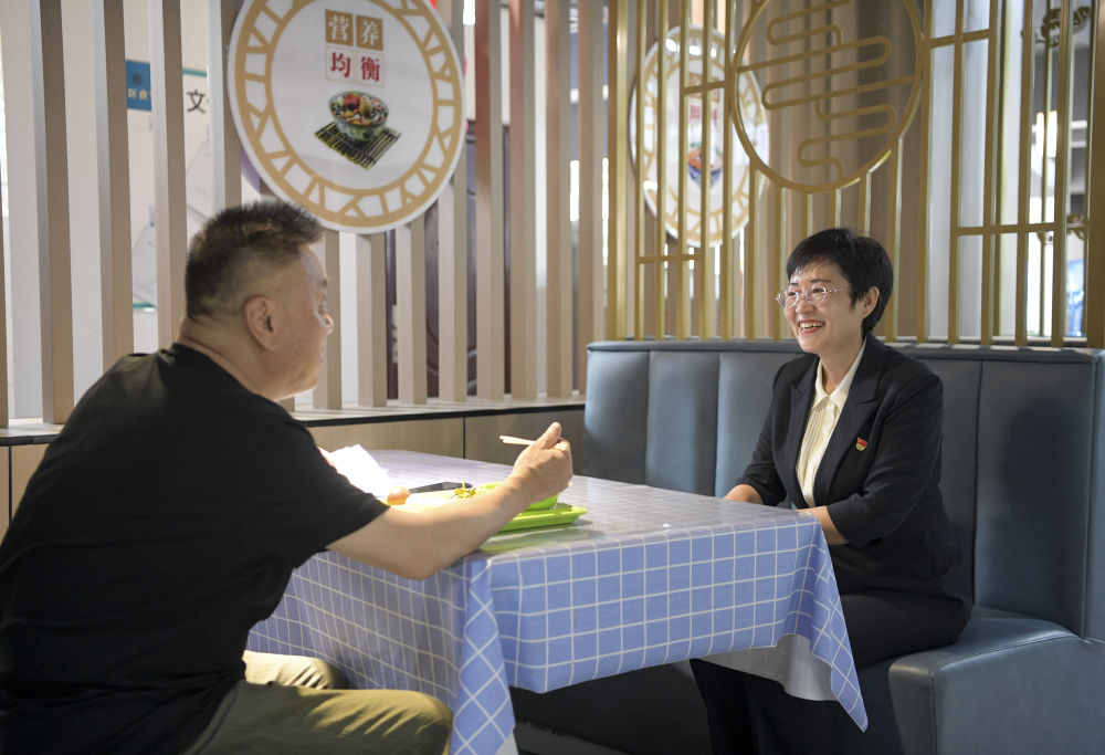 6月20日,寧夏銀川市金鳳區(qū)長(zhǎng)城花園社區(qū)黨委書(shū)記趙耐香在社區(qū)日間照料中心了解食堂運(yùn)行情況。