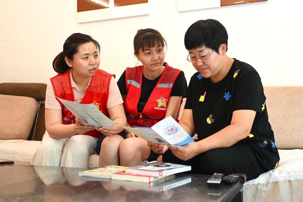 6月20日,寧夏銀川市金鳳區(qū)長(zhǎng)城花園社區(qū)志愿者在入戶為居民提供服務(wù)。