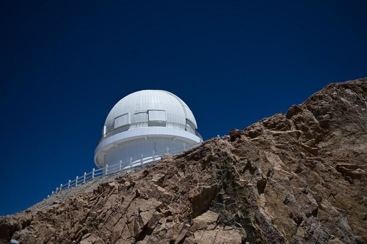 這是在青海省海西蒙古族藏族自治州茫崖市冷湖鎮(zhèn)賽什騰山拍攝的中國科學(xué)技術(shù)大學(xué)和中國科學(xué)院紫金山天文臺聯(lián)合研制的大視場光學(xué)成像望遠鏡——墨子巡天望遠鏡(2024年4月20日攝)。