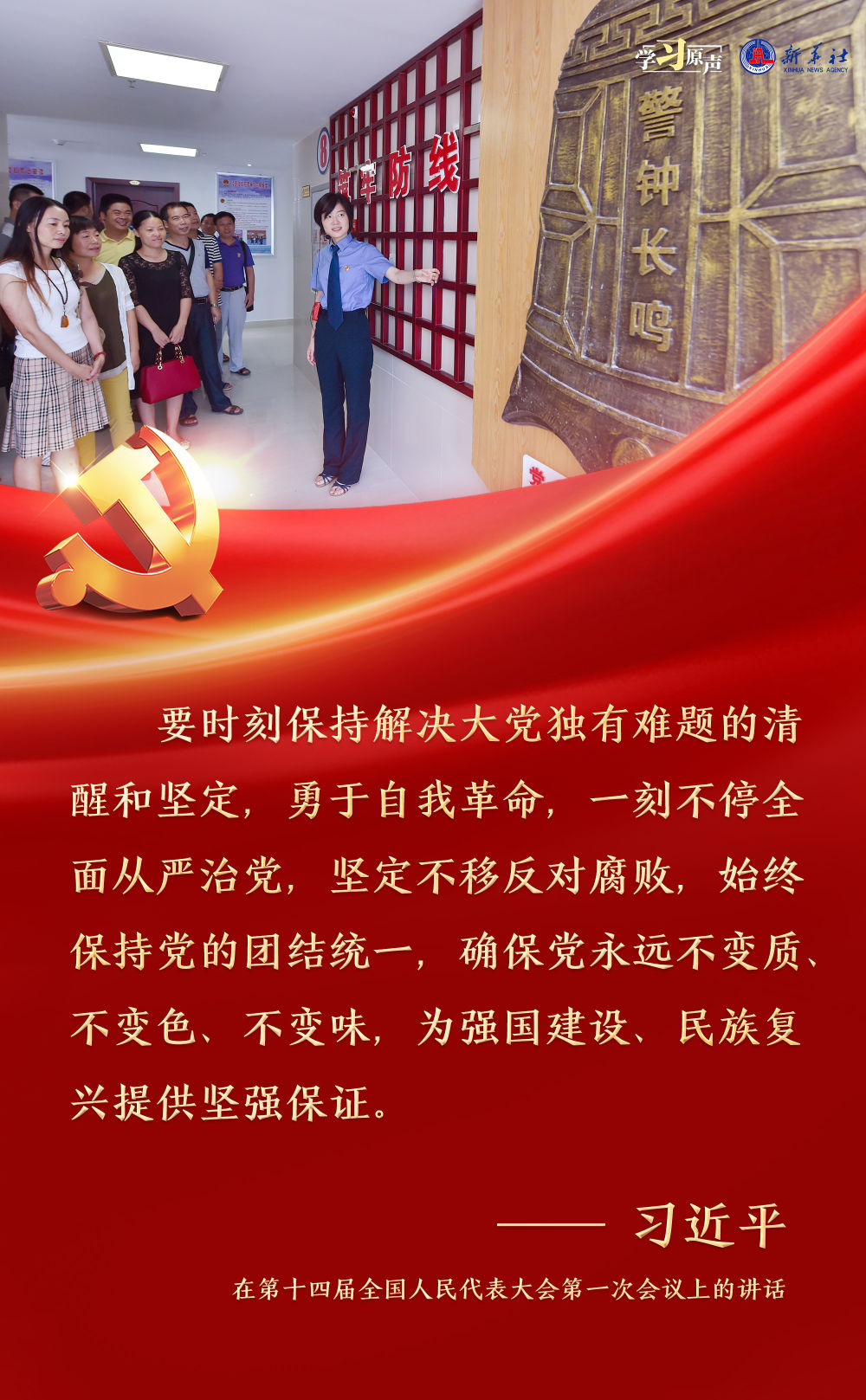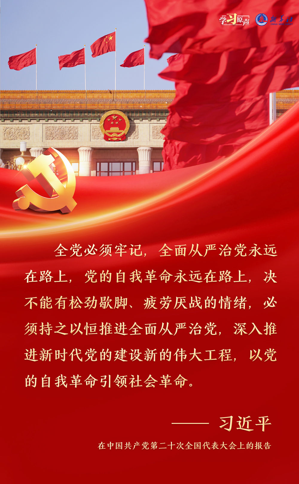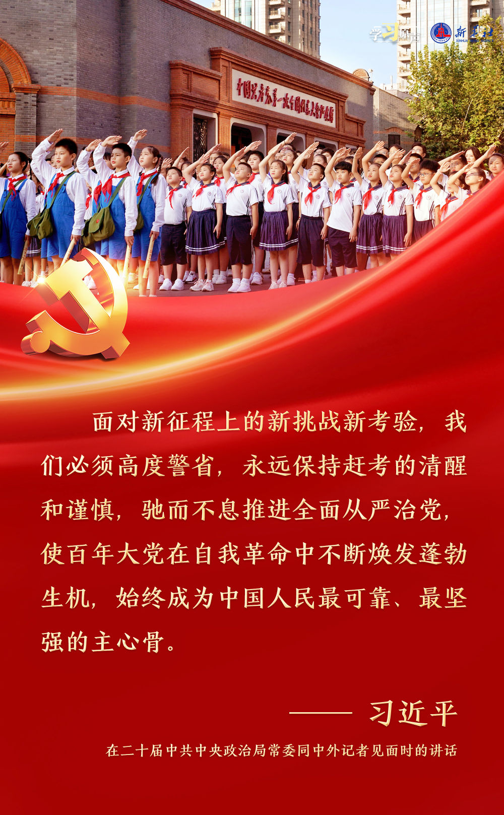 習(xí)近平總書記強(qiáng)調(diào),面對(duì)新征程上的新挑戰(zhàn)新考驗(yàn),我們必須高度警省,永遠(yuǎn)保持趕考的清醒和謹(jǐn)慎,馳而不息推進(jìn)全面從嚴(yán)治黨,使百年大黨在自我革命中不斷煥發(fā)蓬勃生機(jī),始終成為中國(guó)人民最可靠、最堅(jiān)強(qiáng)的主心骨。