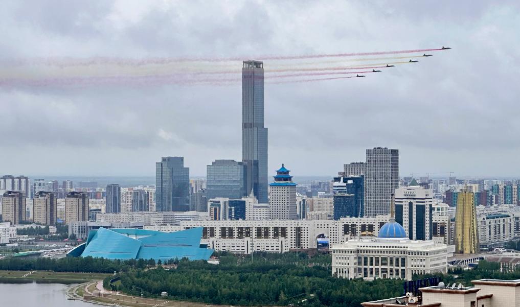 當(dāng)?shù)貢r(shí)間7月3日,國家主席習(xí)近平在阿斯塔納出席哈薩克斯坦總統(tǒng)托卡耶夫舉行的歡迎儀式。習(xí)近平乘車抵達(dá)總統(tǒng)府時(shí),托卡耶夫總統(tǒng)熱情迎接。六架哈薩克斯坦空軍戰(zhàn)機(jī)從總統(tǒng)府上空飛過,拉出象征中國國旗的紅黃色彩煙,以最高禮儀歡迎習(xí)近平對哈薩克斯坦進(jìn)行國事訪問。