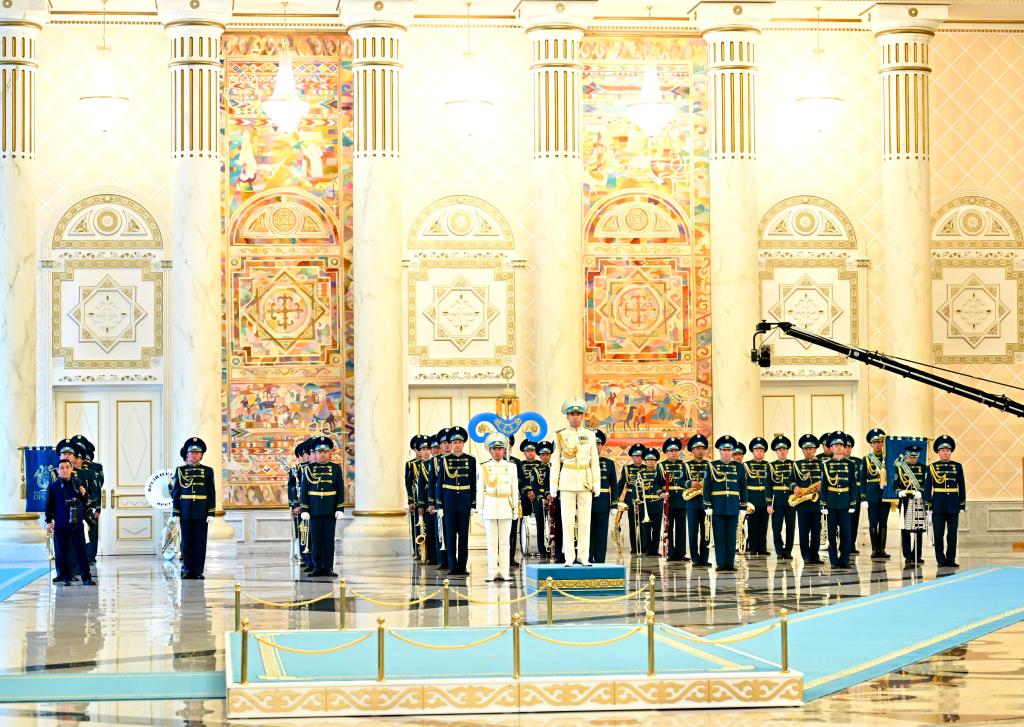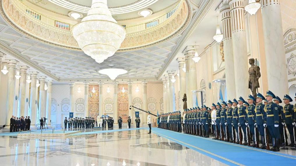 托卡耶夫?yàn)榱?xí)近平舉行隆重歡迎儀式??偨y(tǒng)府大廳氣勢恢宏,禮兵威武挺拔。兩國元首分別同對方陪同人員一一握手致意。兩國元首登上檢閱臺(tái),軍樂團(tuán)奏中哈兩國國歌。習(xí)近平在托卡耶夫陪同下檢閱儀仗隊(duì)。