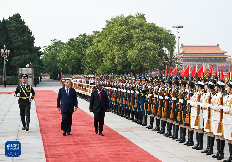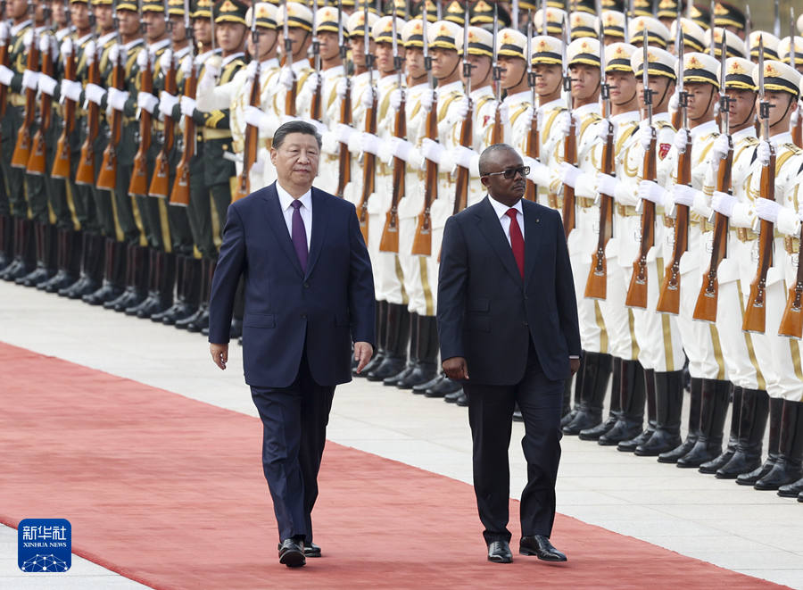 恩巴洛抵達(dá)時(shí),禮兵列隊(duì)致敬。兩國元首登上檢閱臺(tái),軍樂團(tuán)奏中國和幾內(nèi)亞比紹兩國國歌,天安門廣場鳴放21響禮炮。恩巴洛在習(xí)近平陪同下檢閱中國人民解放軍儀仗隊(duì),并觀看分列式。