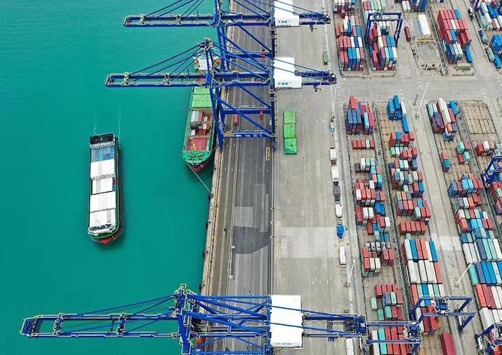 集裝箱貨輪在海南洋浦國(guó)際集裝箱碼頭裝卸貨物。