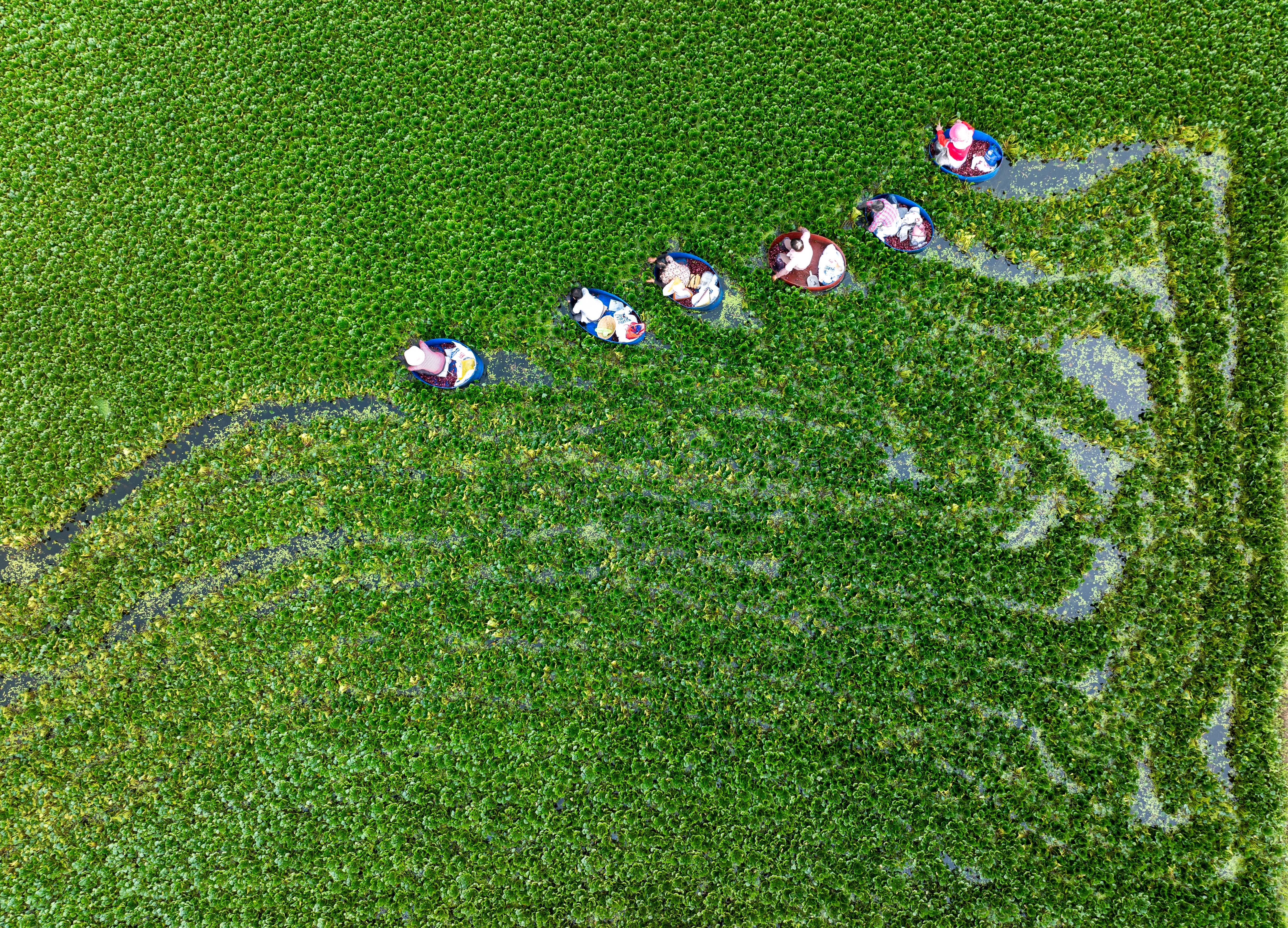2024年8月7日,江蘇淮安市洪澤區(qū)岔河鎮(zhèn)的村民采收菱角。近年來,當(dāng)?shù)乩冒遵R湖優(yōu)質(zhì)水域生態(tài)為依托,帶動當(dāng)?shù)剞r(nóng)民增收致富,助力鄉(xiāng)村振興。