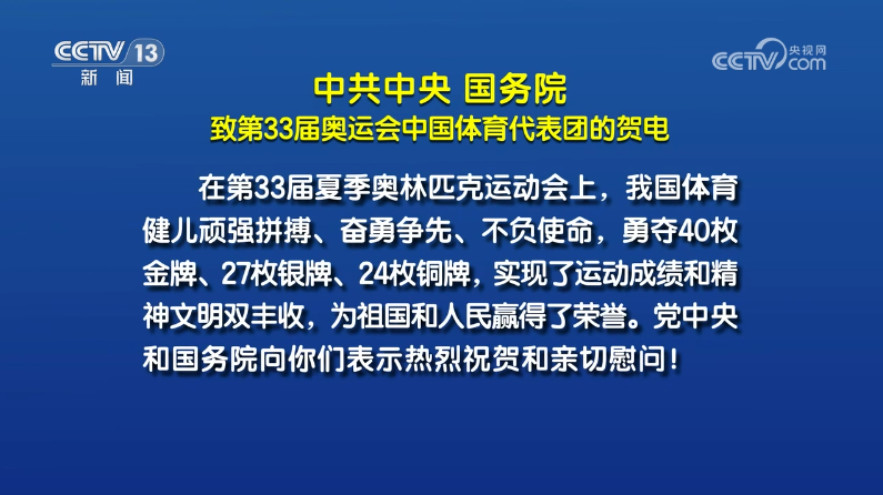 8月11日,中共中央、國(guó)務(wù)院向第33屆夏季奧運(yùn)會(huì)中國(guó)體育代表團(tuán)致賀電,高度評(píng)價(jià)我國(guó)體育健兒“實(shí)現(xiàn)了運(yùn)動(dòng)成績(jī)和精神文明雙豐收,為祖國(guó)和人民贏得了榮譽(yù)”。賀電指出,我國(guó)體育健兒們以?xún)?yōu)異成績(jī)和出色表現(xiàn),進(jìn)一步激發(fā)了海內(nèi)外中華兒女的愛(ài)國(guó)熱情、振奮了民族精神、凝聚了奮進(jìn)力量。