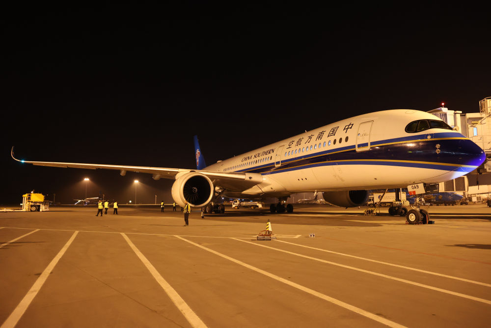 2024年4月24日晚,南航沈陽-法蘭克福CZ8021首航航班在沈陽桃仙國際機(jī)場(chǎng)準(zhǔn)備起飛。這是國內(nèi)航司在東北地區(qū)開通的首條直飛德國定期航線。