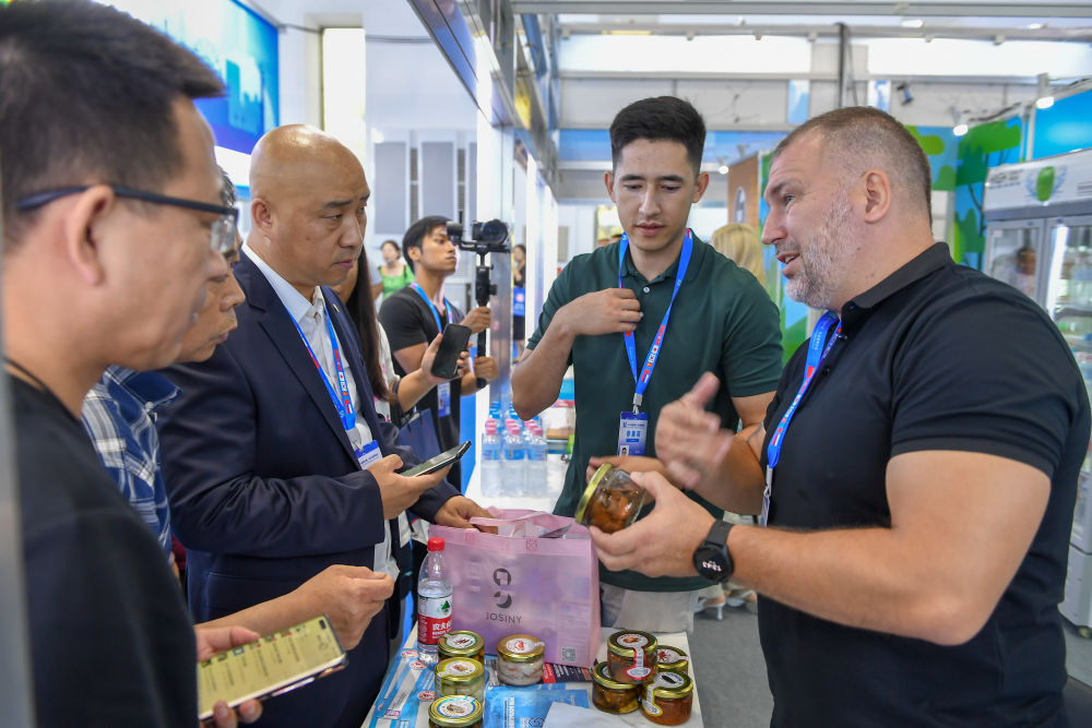 2023年8月23日,在第十四屆中國—東北亞博覽會(huì)東北亞商品館,俄羅斯參展商向參觀者介紹商品。
