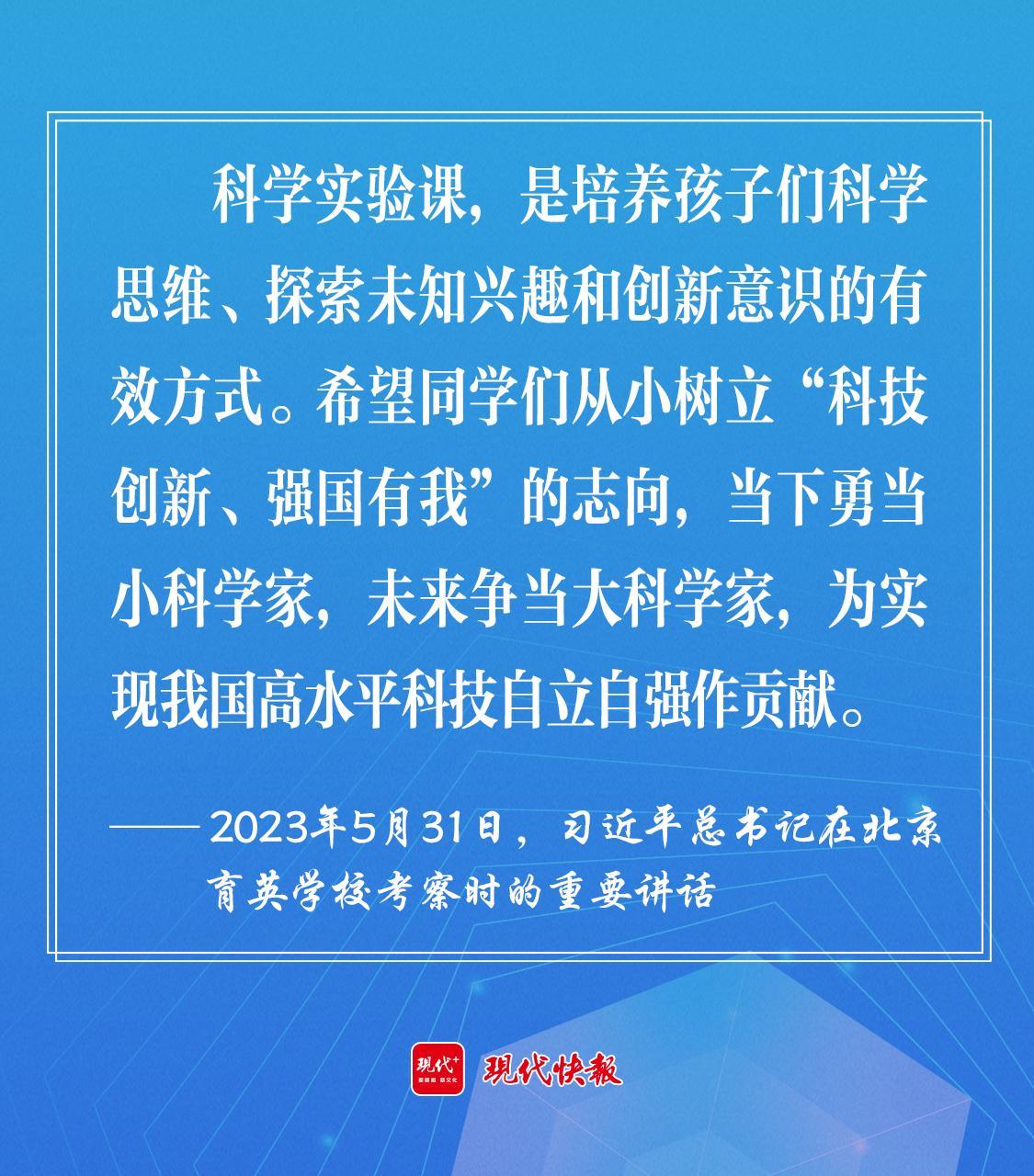 2023年5月,習(xí)近平總書記在北京育英學(xué)??疾鞎r(shí)強(qiáng)調(diào),希望同學(xué)們從小樹立“科技創(chuàng)新、強(qiáng)國(guó)有我”的志向,當(dāng)下勇當(dāng)小科學(xué)家,未來(lái)爭(zhēng)當(dāng)大科學(xué)家,為實(shí)現(xiàn)我國(guó)高水平科技自立自強(qiáng)作貢獻(xiàn)。
