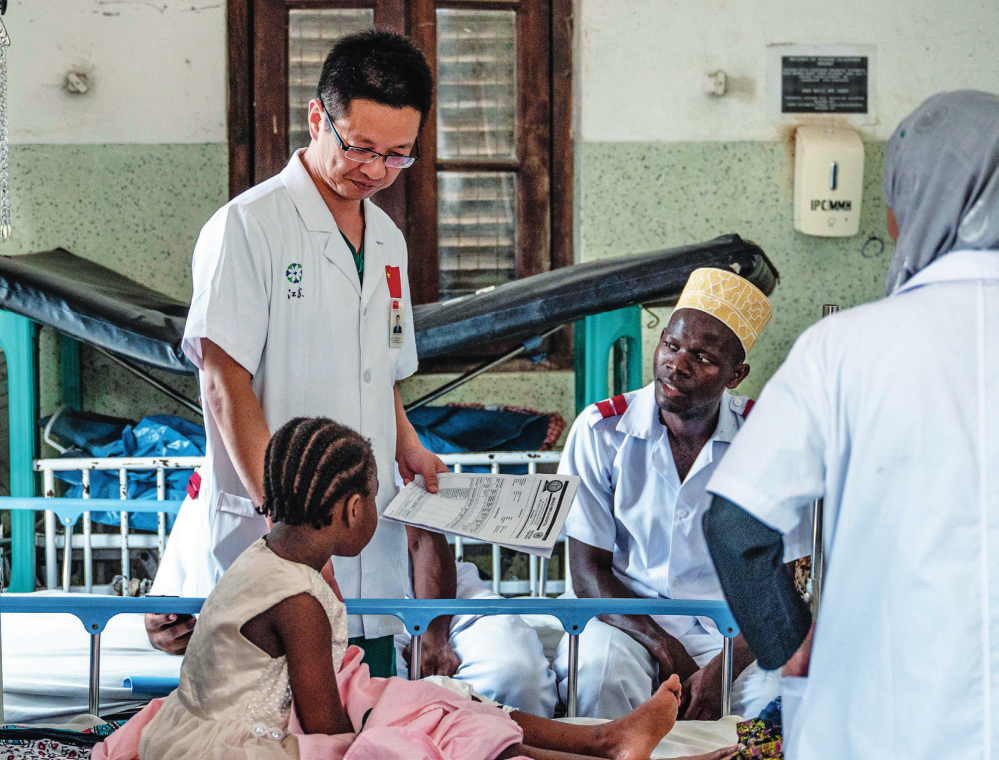 中國援桑給巴爾醫(yī)療隊隊長蔣國慶(左)在坦桑尼亞桑給巴爾的納茲莫加醫(yī)院查房(2023 年 12 月 29 日攝)王冠森攝 / 本刊