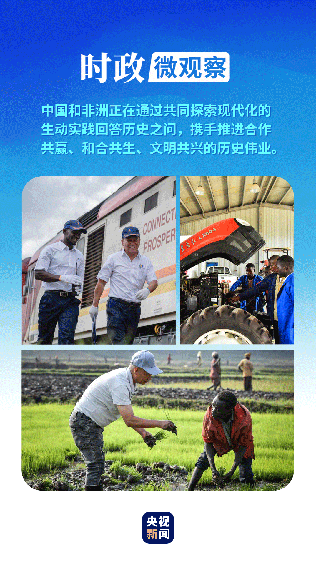 中華大地上生長出來的現(xiàn)代化,描繪了現(xiàn)代化另一幅圖景,創(chuàng)造了人類文明的新形態(tài)。中國實踐向探索中的非洲分享了一個深刻道理:世界上既不存在定于一尊的現(xiàn)代化模式,也不存在放之四海而皆準的現(xiàn)代化標準。