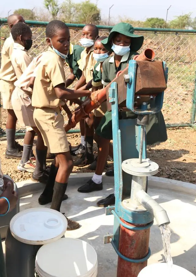 2021年11月,在津巴布韋南馬塔貝萊蘭省省會關達的塞農多小學,學生從中國援建水井里打水。