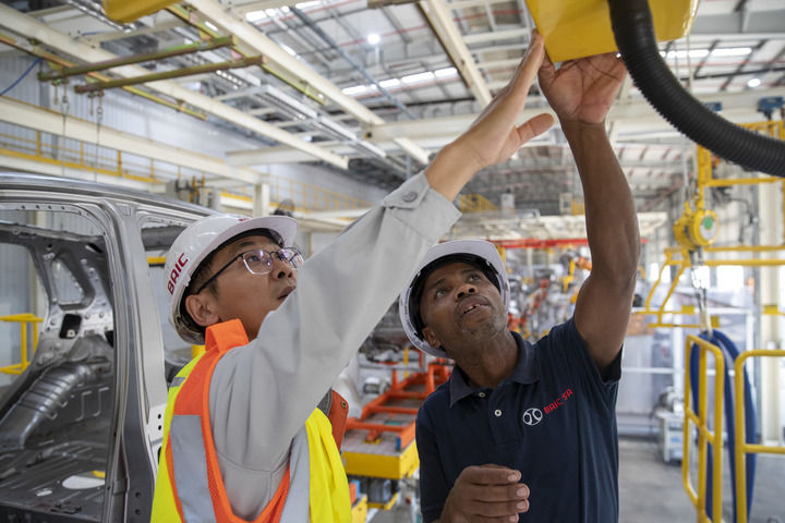 2023年5月9日,在南非東開普省北汽南非工廠,電工邦加尼(右)與中國同事方龍在焊裝車間內工作。新華社記者 張譽東 攝