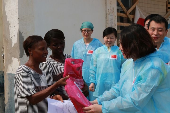 2015年4月4日,在位于塞拉利昂首都弗里敦市郊的中塞友好醫(yī)院埃博拉診療中心,中國第四批援塞醫(yī)療隊副隊長邵蔚(右前)向被治愈的埃博拉出血熱患者贈送禮物。新華社發(fā)(祖榮強 攝)