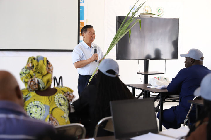 2024年8月4日,在位于盧旺達南方省胡耶區(qū)的中國援盧農(nóng)業(yè)技術示范中心,菌草發(fā)明人林占熺為培訓班學員講解菌草技術。新華社發(fā)(黃萬晴攝)