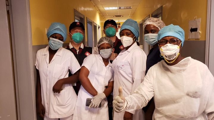 2020年5月26日,中國抗疫醫(yī)療專家組在剛果(布)首都布拉柴維爾指導新冠肺炎病房建設時,與當?shù)匾痪€醫(yī)務人員合影。新華社發(fā)