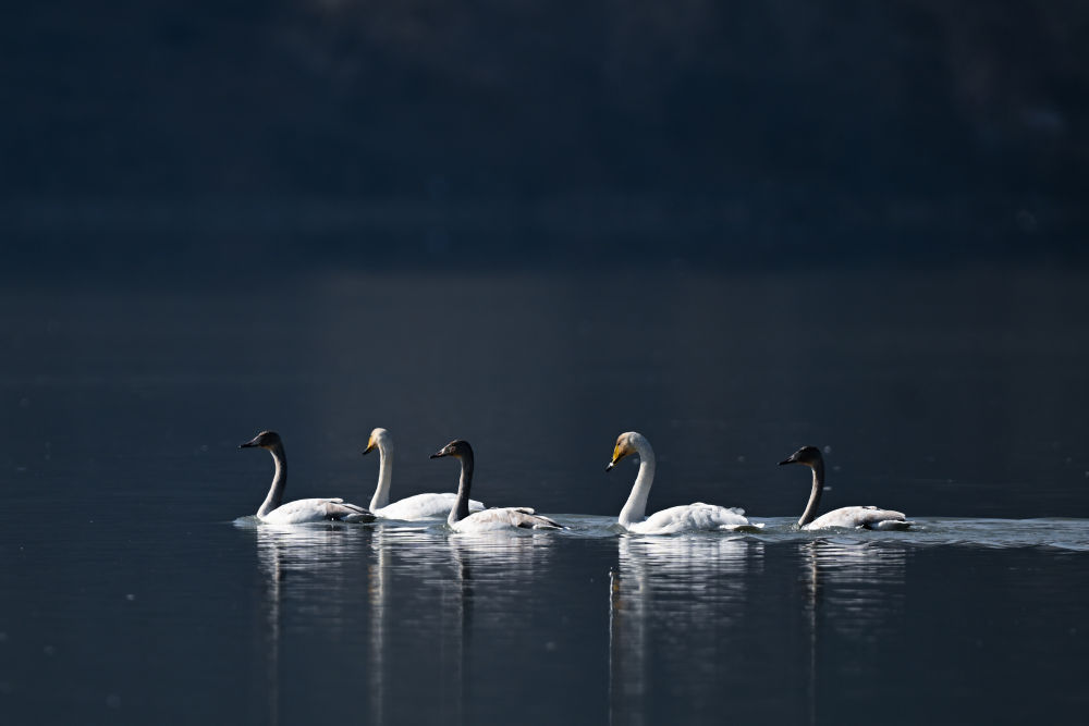 2024年3月16日在內蒙古呼和浩特市托克托縣黃河濕地拍攝的天鵝。隨著當?shù)厣鷳B(tài)環(huán)境持續(xù)改善,候鳥數(shù)量連年增加。