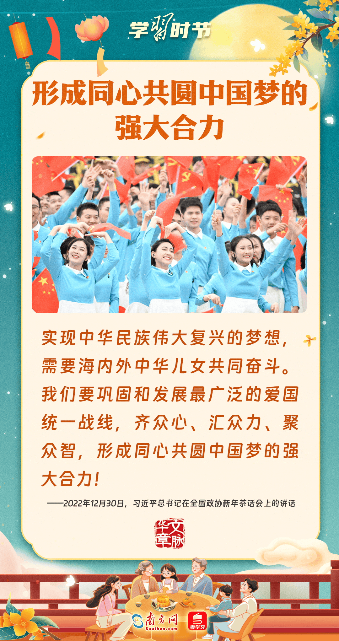 明月寄相思,家國總關(guān)情。作為中華優(yōu)秀傳統(tǒng)文化的重要載體之一,中秋節(jié)不但寄托著海內(nèi)外華人對闔家團(tuán)圓的美好期許,還承載著深厚的故鄉(xiāng)情、家國情。習(xí)近平總書記曾在多個(gè)場合深刻闡述個(gè)人、家庭與國家之間的關(guān)系,強(qiáng)調(diào)要厚植家國情懷,把實(shí)現(xiàn)個(gè)人夢、家庭夢融入國家夢、民族夢之中。中秋佳節(jié),讓我們一起回顧總書記那些經(jīng)典話語,共同感受他至深至厚的家國情懷。