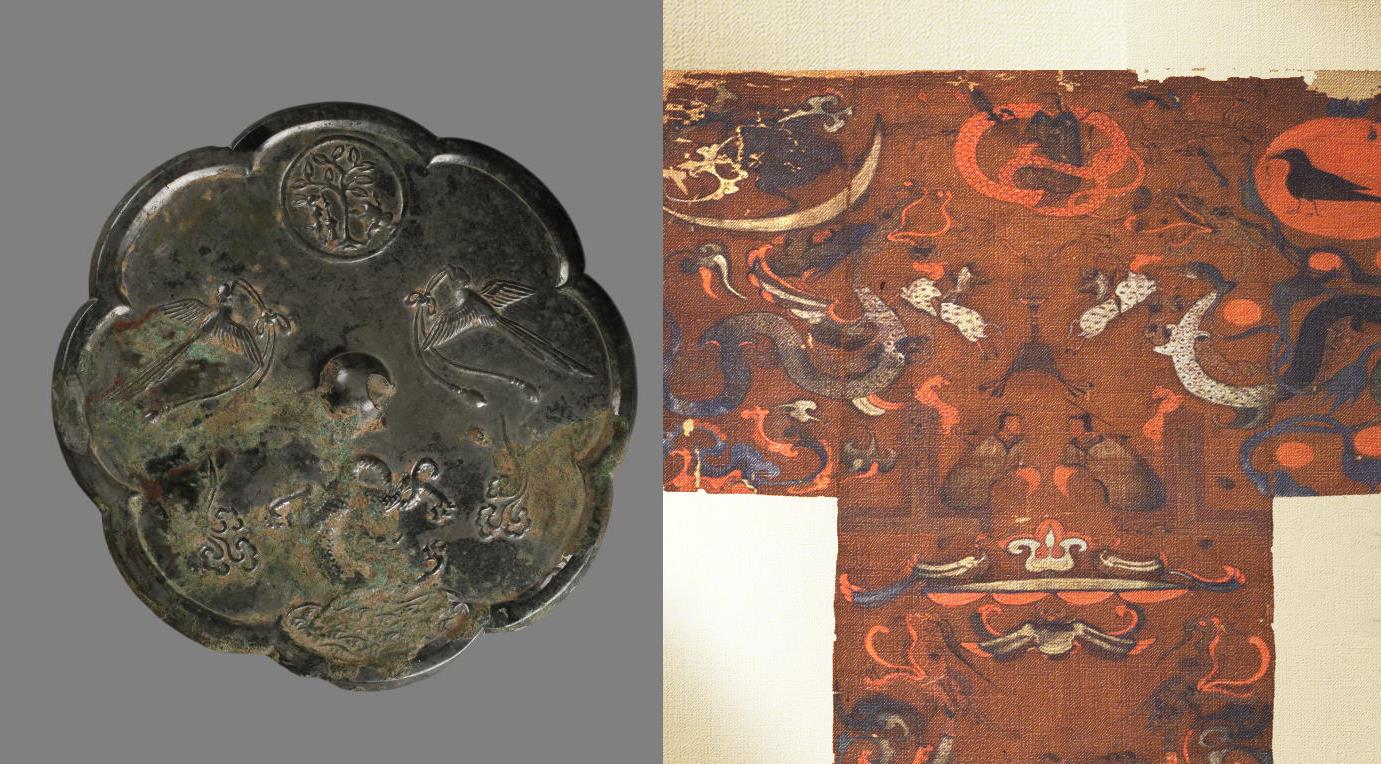 △陜西歷史博物館珍藏的雙鸞月宮紋葵花形鏡(左)和湖南博物院展出的馬王堆漢墓出土的T形帛畫(huà)(右)