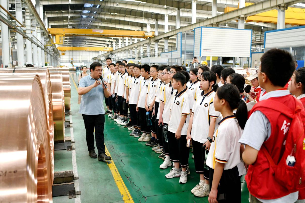 2023年6月9日,在安徽某公司銅板帶制造車(chē)間,銅陵市第七中學(xué)學(xué)生在上“行走的思政課”。