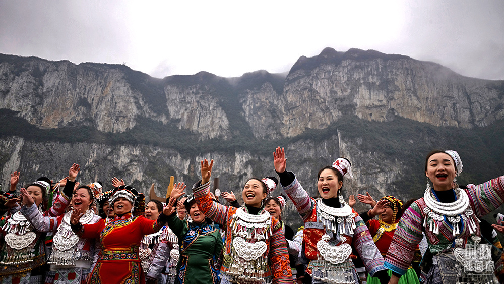 2021年2月,習(xí)近平總書記來到貴州化屋村考察,當(dāng)?shù)卮迕裼脷g快的苗家歌舞迎接總書記。(總臺央視記者王哈男拍攝)