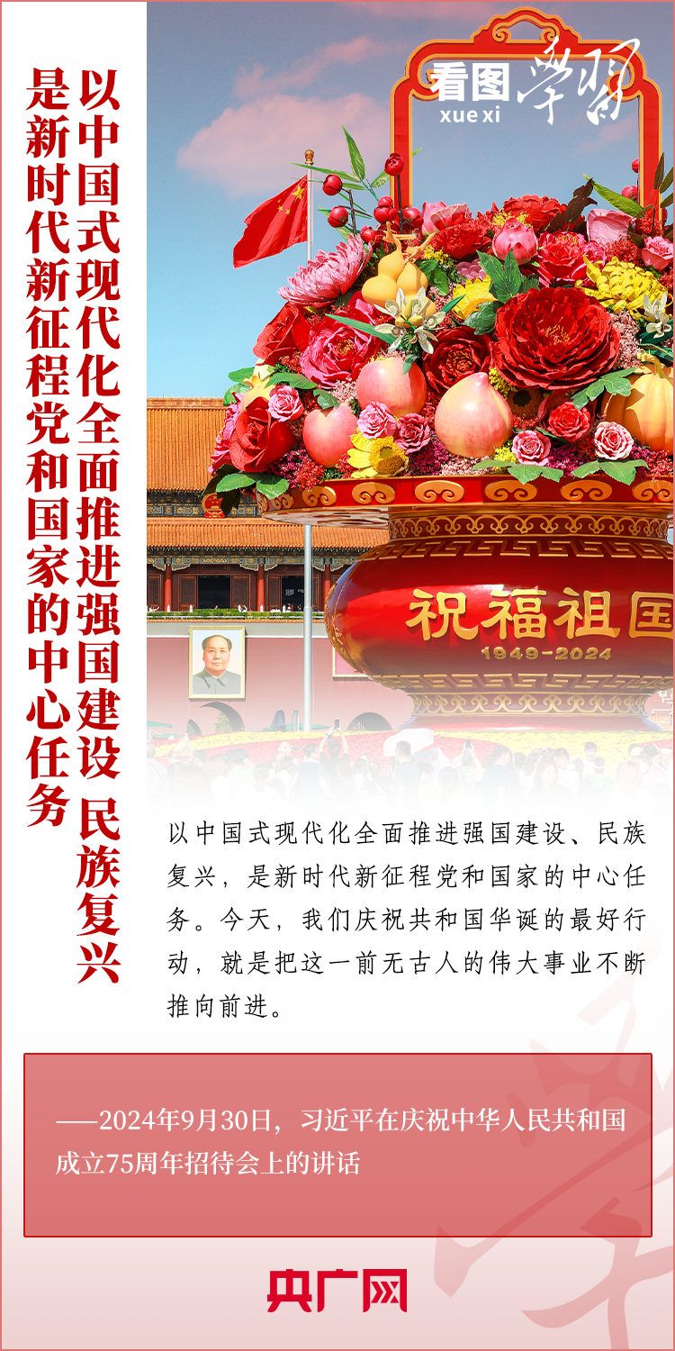 “經(jīng)過75年的艱苦奮斗,中國式現(xiàn)代化已經(jīng)展開壯美畫卷并呈現(xiàn)出無比光明燦爛的前景?!?月30日,慶祝中華人民共和國成立75周年招待會(huì)在京舉行。習(xí)近平總書記出席招待會(huì)并發(fā)表重要講話??倳洀?qiáng)調(diào),以中國式現(xiàn)代化全面推進(jìn)強(qiáng)國建設(shè)、民族復(fù)興,是新時(shí)代新征程黨和國家的中心任務(wù)。我們慶祝共和國華誕的最好行動(dòng),就是把這一前無古人的偉大事業(yè)不斷推向前進(jìn)。