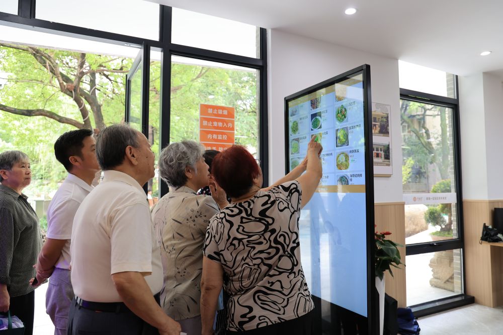 “陳老師,你今天不宜吃海鮮和豆制品,一會兒別忘了。”“老沈,你少吃點重口味的菜,最近是不是血壓又高了?”幾位老人對著屏幕上的用餐建議,彼此提醒著。