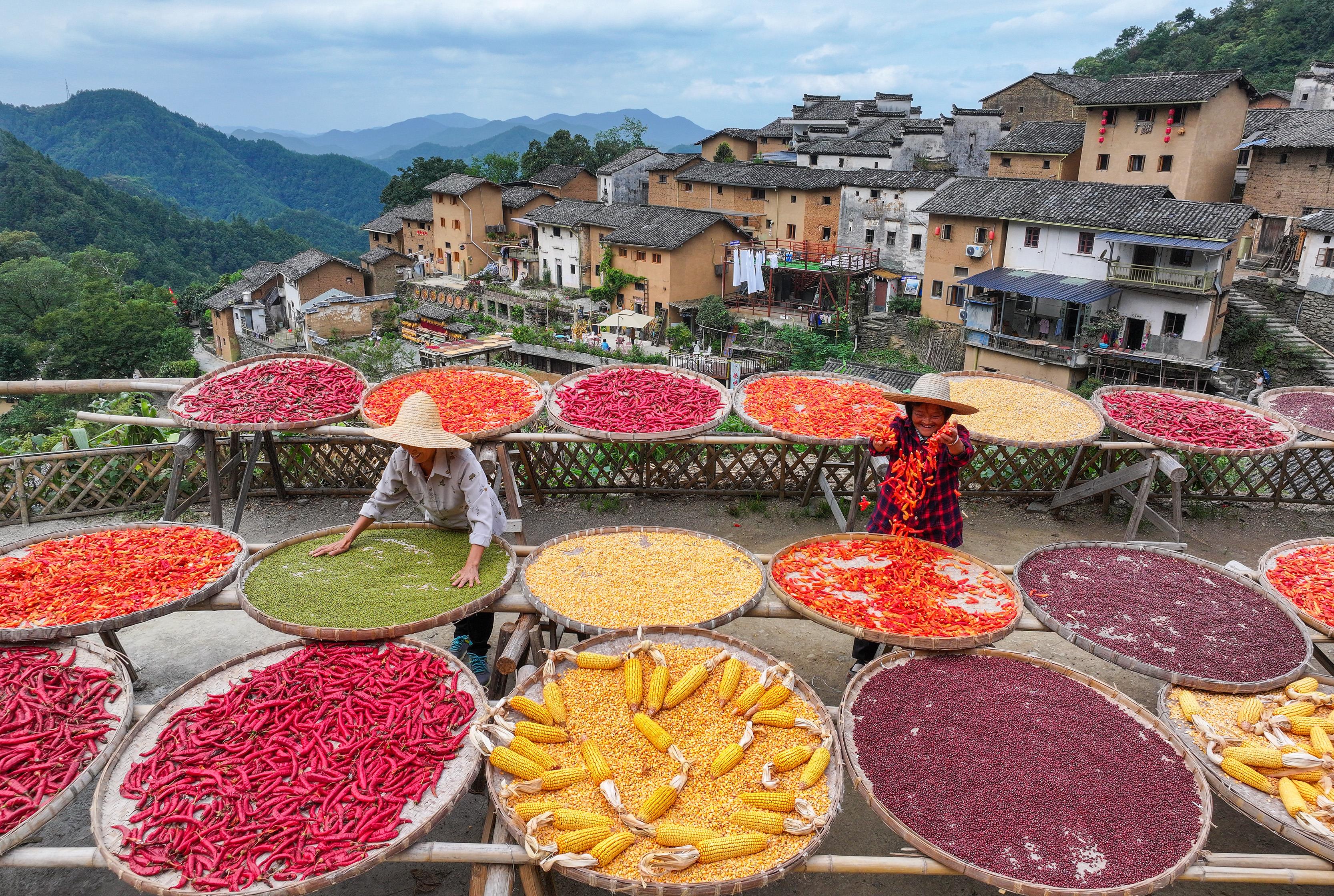 2024年9月22日,安徽省黃山市歙縣陽產(chǎn)村,村民正在土樓前晾曬農(nóng)作物。