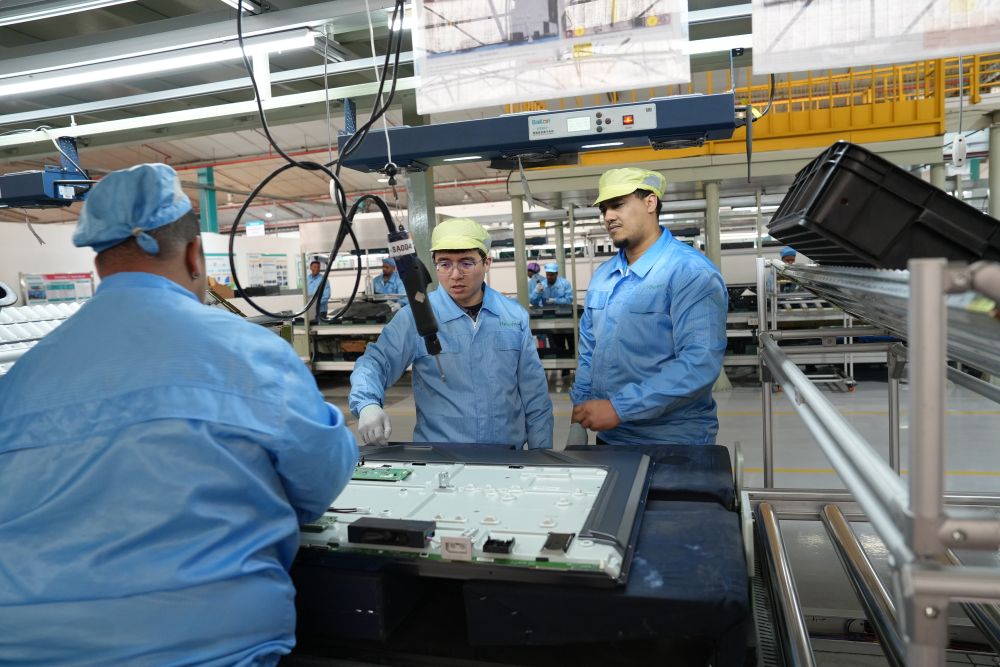 2024年8月14日,中方工程師(中)在南非開普敦的海信南非工業(yè)園電視機(jī)生產(chǎn)線上指導(dǎo)當(dāng)?shù)貑T工工作。工業(yè)園已為當(dāng)?shù)貏?chuàng)造1000多個(gè)直接就業(yè)機(jī)會、5000多個(gè)間接就業(yè)崗位,帶動地區(qū)產(chǎn)業(yè)鏈發(fā)展。