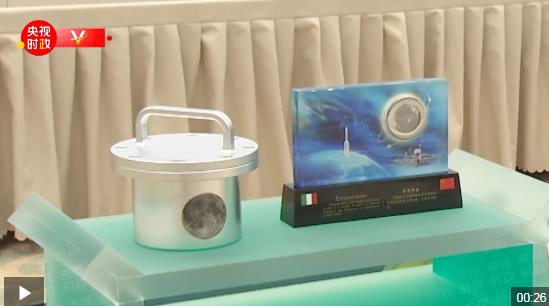 工藝擺件以嫦娥五號(hào)探月為設(shè)計(jì)元素,月球部分裝有月壤??蒲袠悠窞樵氯犁P取樣和鉆取樣,展現(xiàn)了中意航天領(lǐng)域合作高水平。