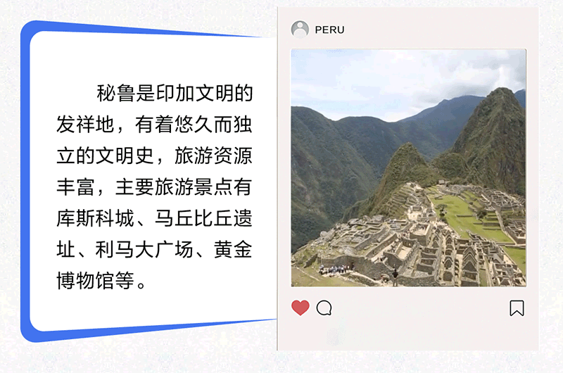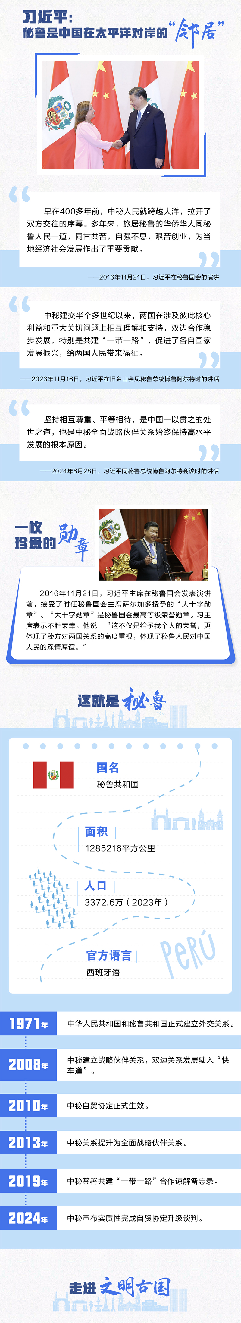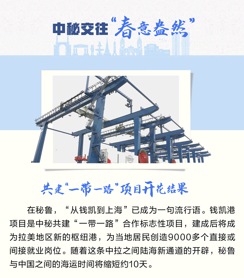 中國和秘魯都是文明古國,兩國友誼源遠流長,人民友好深入人心。習近平主席曾以“秘魯是中國在太平洋對岸的‘鄰居’”形容中秘關系,生動詮釋了兩國和兩國人民之間“相知無遠近”的深厚友誼。