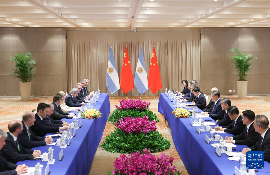 當地時間11月19日上午,國家主席習近平在里約熱內盧出席二十國集團領導人峰會期間會見阿根廷總統(tǒng)米萊。新華社記者 張領 攝
