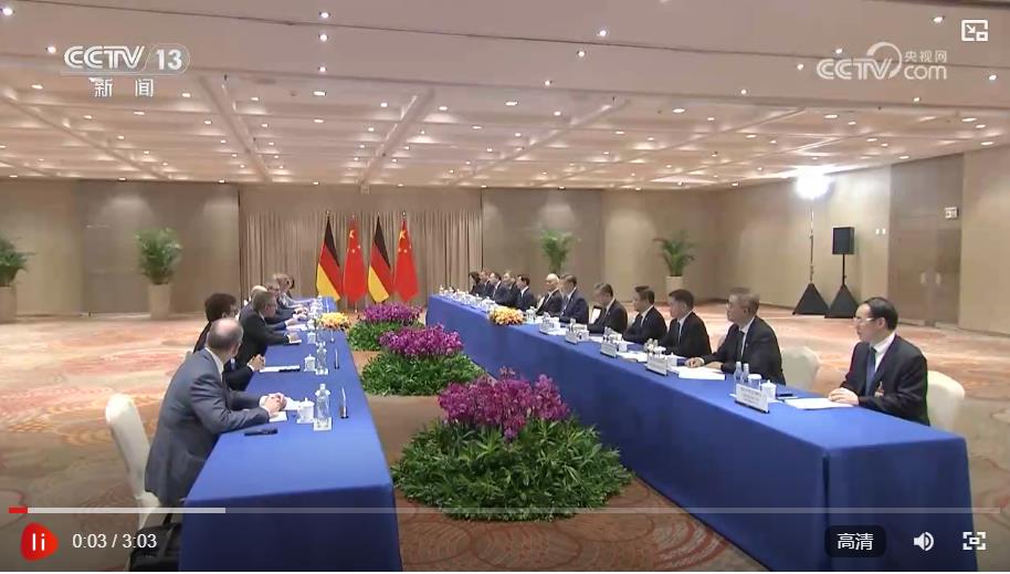 習(xí)近平指出,今年4月你訪問中國,我們進行了坦誠深入、富有成效的交流。半年多來,兩國在綠色發(fā)展、可持續(xù)交通、對非洲農(nóng)業(yè)合作等領(lǐng)域合作取得重要成果,中德關(guān)系持續(xù)煥發(fā)新的生機和活力。當(dāng)前,世界百年變局加速演進,全球發(fā)展處于關(guān)鍵十字路口。中國和德國作為世界第二、第三大經(jīng)濟體和具有重要影響力的大國,要堅持從長遠(yuǎn)和戰(zhàn)略角度鞏固中德全方位戰(zhàn)略伙伴關(guān)系,續(xù)寫相互成就的合作故事。